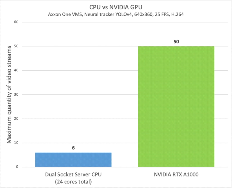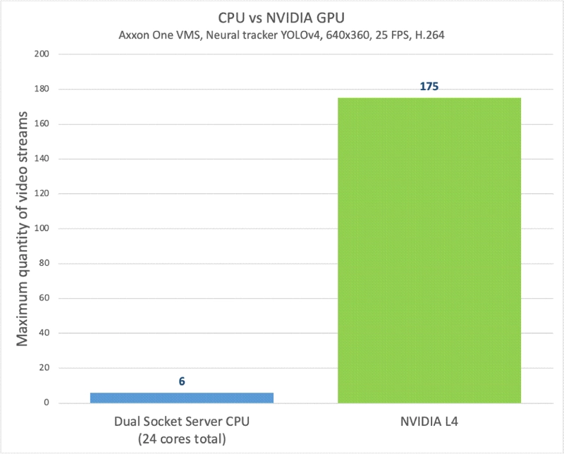 NVIDIA GPUs enabled AxxonSoft to process several times more video streams compared to traditional CPU-only configurations, offering a more cost-effective solution for video analytics at scale: