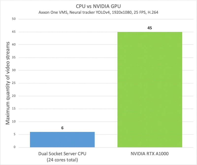 Chart 4: Comparison of the maximum number of video streams (1920x1080) simultaneously processed on CPU-based and NVIDIA RTX A1000 professional GPU–based configurations when running a neural tracker (pedestrian and vehicle detection and tracking)